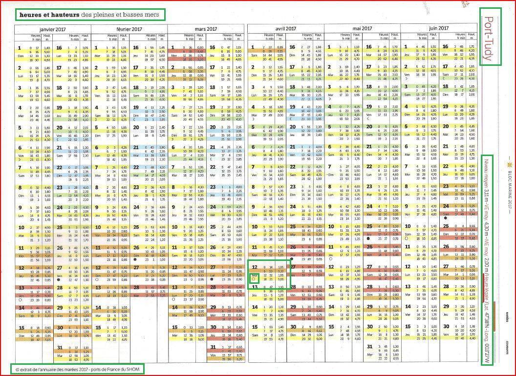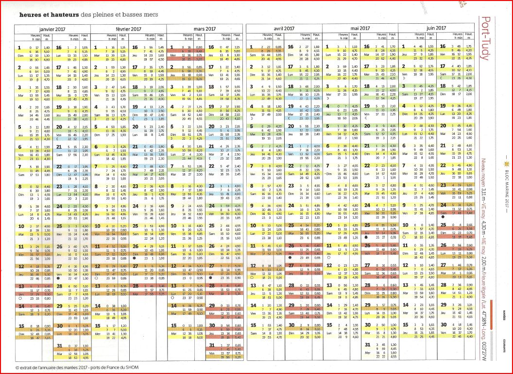 Attention: les heures sont données cette fois en Heure Légale. C'est à dire en UTC+1 en hiver et UTC + 2 en été. Il n'y a donc pas de correction à faire. C'est un choix de l'éditeur du BMA. D'autres éditeurs pourraient faire un autre choix, comme par exemple l'Almanach du Marin Breton