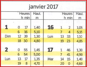 Le long de nos côtes atlantiques, on remarque qu'il y a 2 PM et 2 BM par jour. On dit que la marée est semi-diurne. Ainsi sur l'extrait de table de marée ci-contre, on peut voir les Heures et les Hauteurs de PM et BM pour les 1, 2, 16, 17 janvier. Comment expliquer ce phénomène?