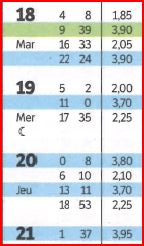 Tous les jours, on s'aperçoit que l'heure de la marée avance. Ainsi dans le tableau ci-dessus, on remarque que la 2ème PM du 10 est à 15h35 et celle du 11 est à 16h25 soit 50 minutes plus tard.